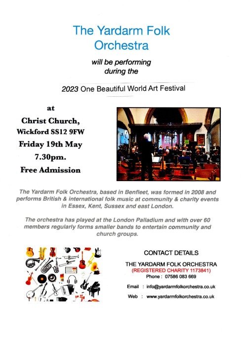 The Yardarm Folk Orchestra plays British and international folk music throughout the region and celebrates Folk from around the world through its lively and spirited appearances appealing to audiences both young and old. They have played at over 650 community, charity and fundraising events including the Leigh Folk Festival and Tenterden Folk Festival. They have also performed at well-known venues including the London Palladium and Cliffs Pavilion.